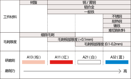 参照下图,根据工件材料、毛刺尺寸、目标表面粗糙度等信息选择刷子的类型。