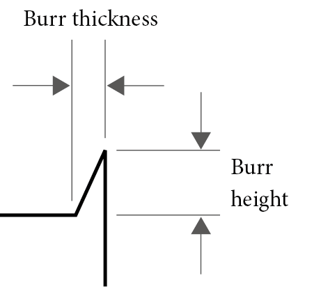 Maximum burr thickness is 0.1 mm. Burrs this size can be easily bent by fingernail.