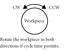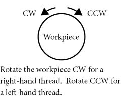 The workpiece should be rotated clockwise (CW) for a right-hand thread and counterclockwise (CCW) for a left-hand thread. If the correct rotational direction and brush angle (22.5 deg.) are used, the brush can be pulled easily along the thread. However, the angled brush will catch on the thread and break if the incorrect rotational direction is used.