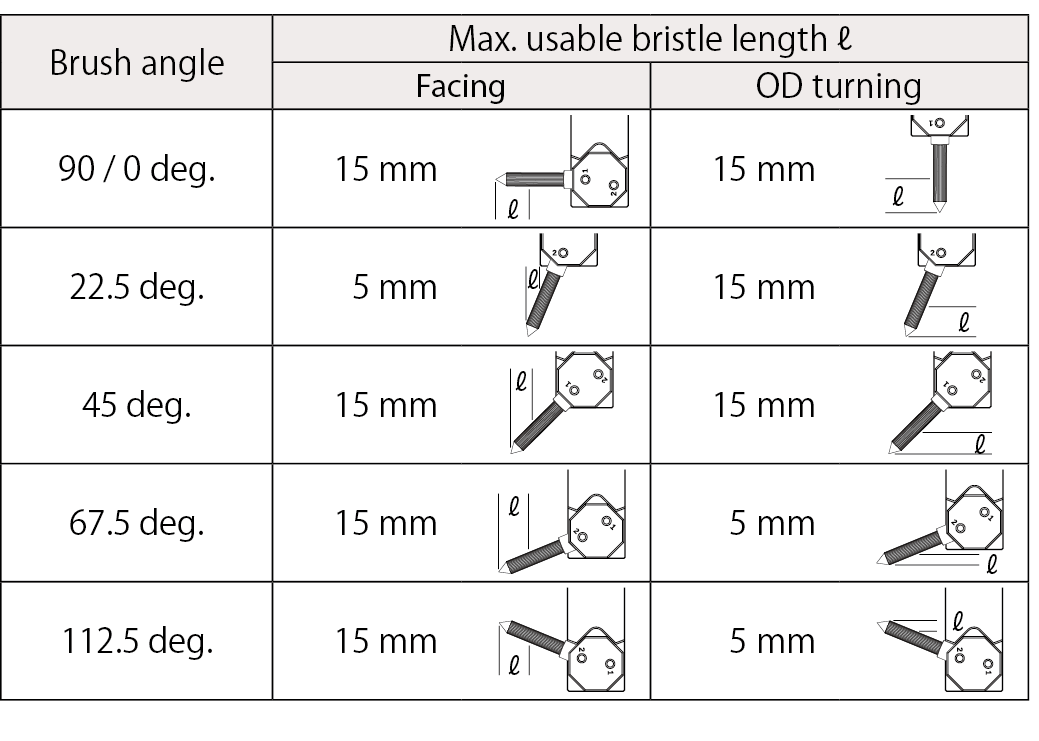 | Brush diameter (mm) | Brush angle | Max. usable bristle length |