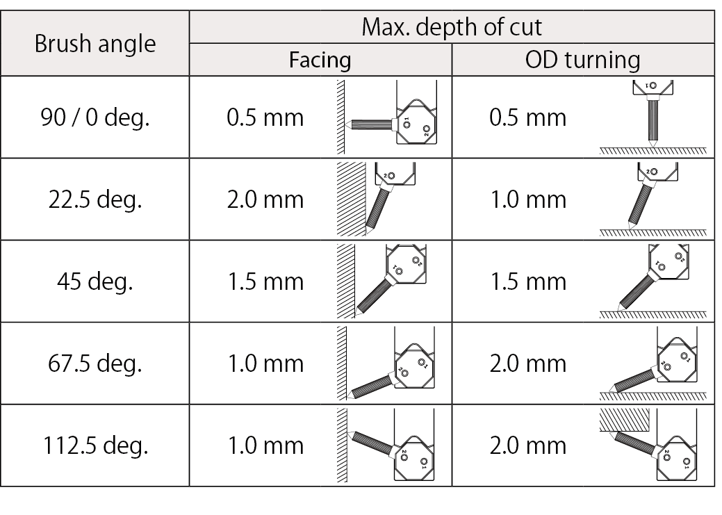 The brush angle of XEBEC Brush Turning Round Shank is fixed at 20 degrees. Maximum depth of cut is 2.0 mm.