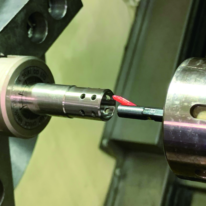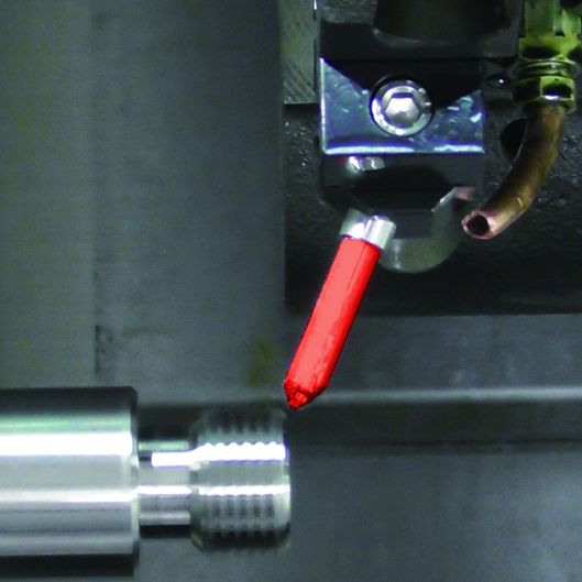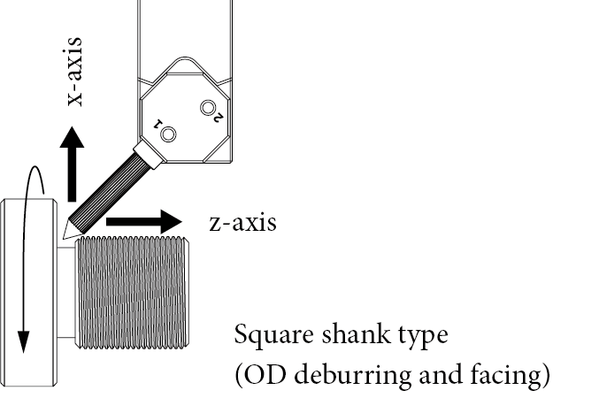 This is a specialist pull turning and facing tool. Pulling the brush reduces bristle deflection and negotiates discontinuous geometries such as crossholes. The bristles will break if the brush is pushed. The tool must be pulled in the x-axis away from the main spindle when facing and pulled in the z-axis away from the main spindle when ID or OD deburring.