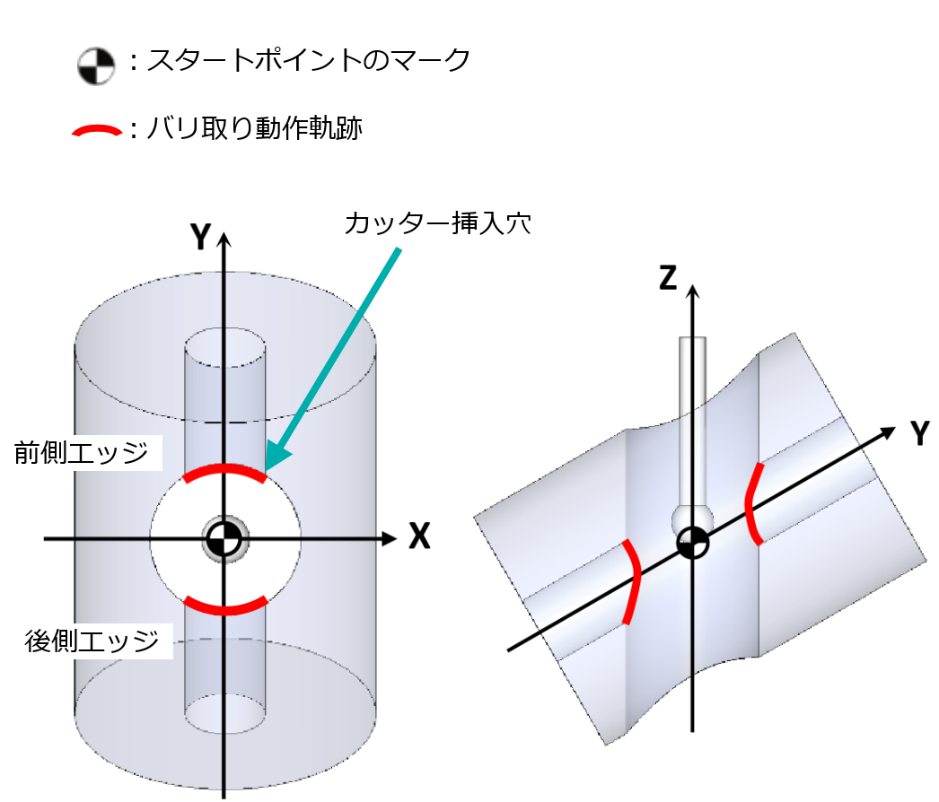 スタートポイントのX・Y座標はカッター挿入穴の中心位置、Z座標はカッター挿入穴と交差穴のそれぞれの中心軸が交差する高さです。