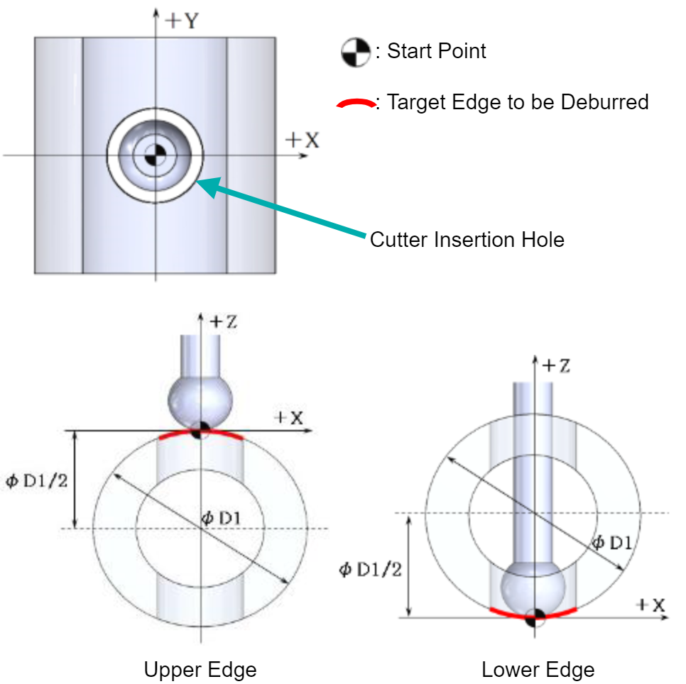 Start Point refers to the initial tool position from which XEBEC Back Burr Cutter and Deburring Tool Path is to begin the deburring operation. Program the tool position so that the centerline and the tip of the Cutter is precisely aligned with the Start Point that we specify. XEBEC Deburring Tool Path should run once the Cutter is brought precisely at this position. The Start Point is at the center of the Cross Hole in the XC plane.