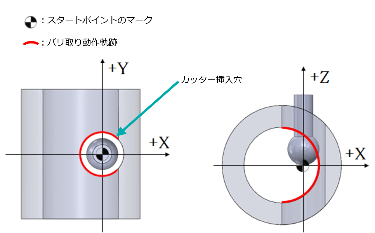 スタートポイントのX・Y座標はカッター挿入穴の中心位置、Z座標は交差穴の中心高さです。