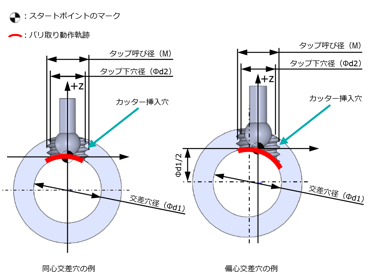 スタートポイントの一例を下記に示します。(同心交差穴の例、偏心交差穴の例)