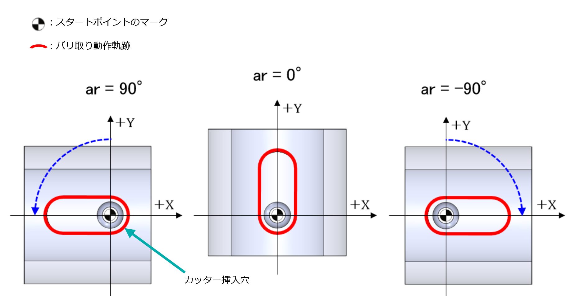 交差穴がX軸方向に向いている場合でar=90°とした時はXプラス側のR中心がスタートポイント、およびar=-90°とした時はXマイナス側のR中心のスタートポイントです。